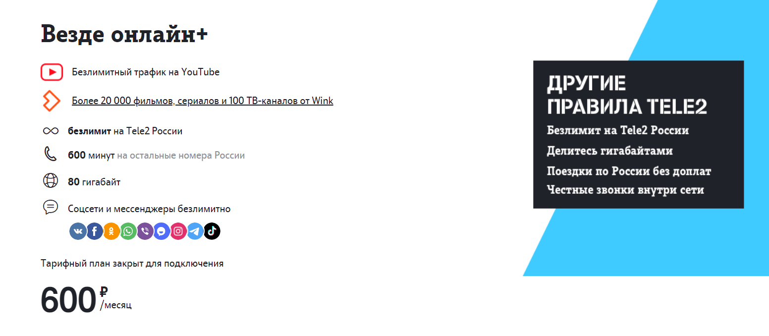 Решение избавиться от тарифа, мягко говоря, странное, учитывая тот факт, что на сайте оператора «Везде онлайн+» был помечен ленточкой «Хит продаж». Он предоставлял абоненту 600 минут звонков, 80 ГБ интернет-трафика, 50 SMS, безлимитные приложения популярных соцсетей и мессенджеров, а также, пожалуй, одну из ключевых фишек тарифа, — безлимитный трафик на YouTube. Все это за адекватную абонентскую плату в 600 рублей в месяц (версия для Москвы и Московской области).
