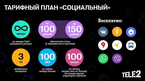 Компания Tele2 анонсировала новый тарифный план «Социальный», цена которого в зависимости от региона будет варьироваться от 100 до 150 рублей. За такие деньги это достаточно выгодный тариф, поскольку помимо полностью бесплатных разговоров с номерами Tele2 в домашнем регионе он предоставляет небольшой пакет трафика и возможность бесплатного использования популярных сервисов и приложений.