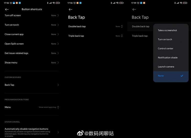 Скриншоты меню настроек демонстрируют, что телефоны Xiaomi, как и iPhone, будут распознавать двойные и тройные постукивания по задней крышке. С их помощью можно делать скриншоты, включать фонарик, разворачивать шторку уведомлений, запускать центр управления или приложение камеры.