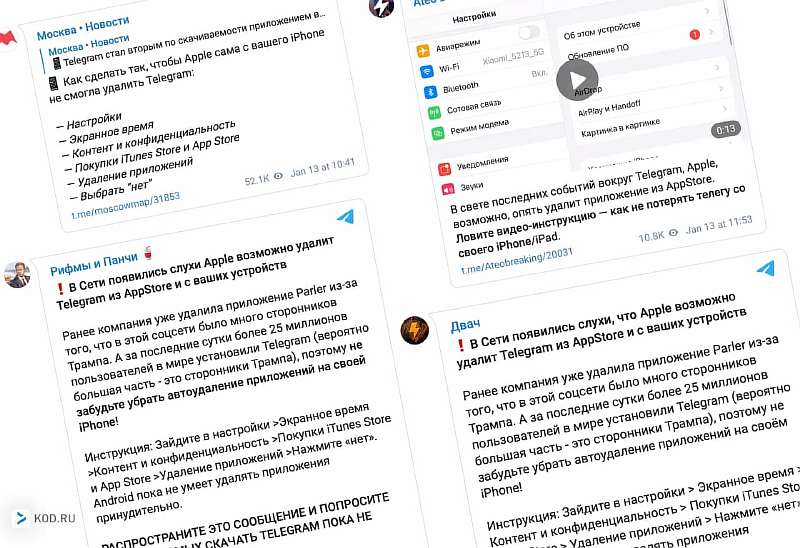 После этого миграция продолжались в Telegram — по словам Дурова, за последние дни мессенджер получил 25 миллионов новых пользователей. И пока американские СМИ пишут, что сторонники Трампа через Telegram призывают к насилию и срыву инаугурации Джо Байдена, Telegram-каналы активно хайпят на ситуации. Они публикуют сообщения, что приложение скоро удалят с AppStore и устройств пользователей, а также прилагают инструкцию, как сохранить Telegram на айфоне: