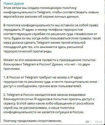Также о намерении сотрудничать с властями рассказал создатель сервиса Павел Дуров. Он считает, что принятое решение не поспособствует разблокировке Телеграма в России.