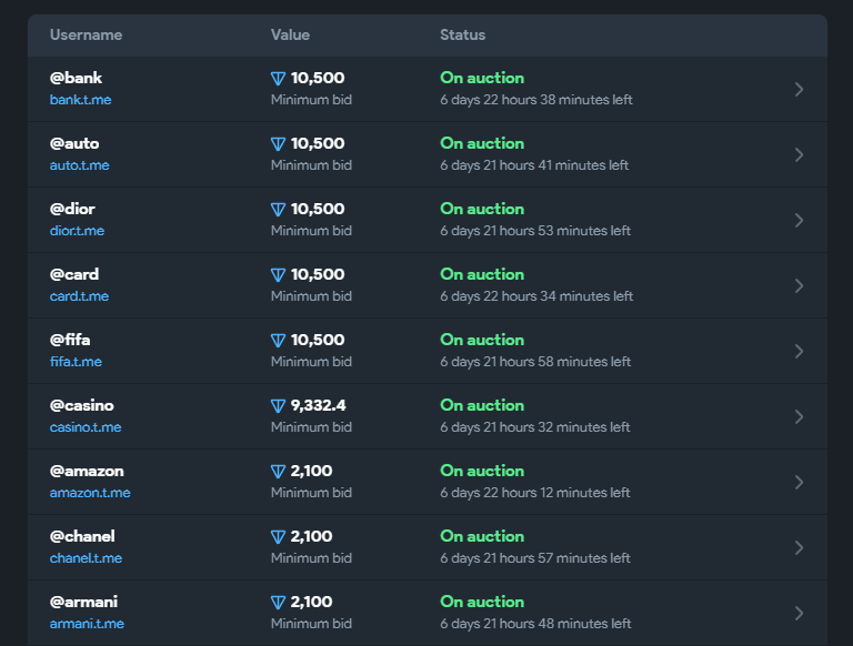 Чем короче юзернейм, тем больше начальная ставка. Самые «козырные» четырехсимвольные ссылки вроде @bank, @auto, @dior, @card, @fifa стоят по 10 тысяч TON, что эквивалентно примерно 19 000 долларов или 1 170 000 рублей. Короче говоря, сумму придется отвалить приличную. Но юзернейм подлиннее обойдется дешевле.