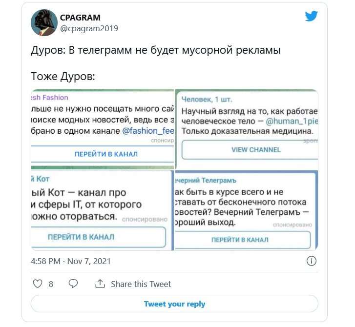 Реклама в Телеграме начала работать пару дней назад – 7 ноября – и уже вызвала шквал критики от пользователей мессенджера.