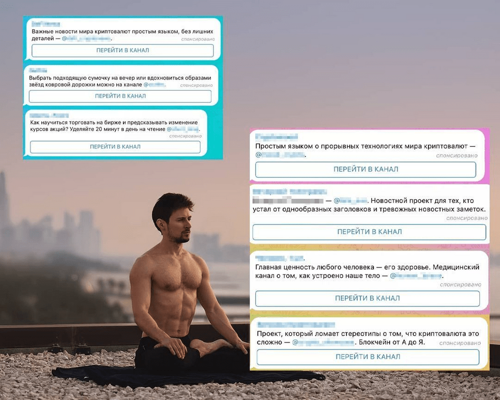 Однако что-то пошло не так: в первый же день в мессенджере начали показывать рекламу никому неизвестных полупустых Телеграм-каналов, еще и созданных сразу после запуска Telegram Ads. Их тематика — криптовалюты, мода, обучение торговле на бирже, новости, медицина в гифках. В общей сложности таких каналов оказалось 16.