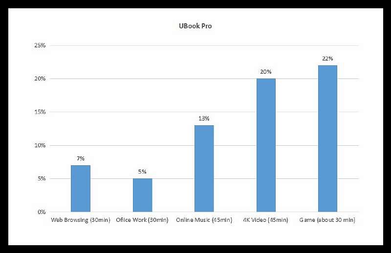 По завершении всех тестов UBook Pro сохранил 33% заряда. Согласно гистограмме, батареи планшета может хватить на 10 часов автономной работы с документами или на 7 часов просмотра веб-страниц. Очевидно, что емкости аккумулятора мощностью 38 Втч вполне достаточно для работы устройства в течение целого рабочего дня. Кроме того, благодаря быстрой зарядке PD можно зарядить батарею, не прерывая работу.