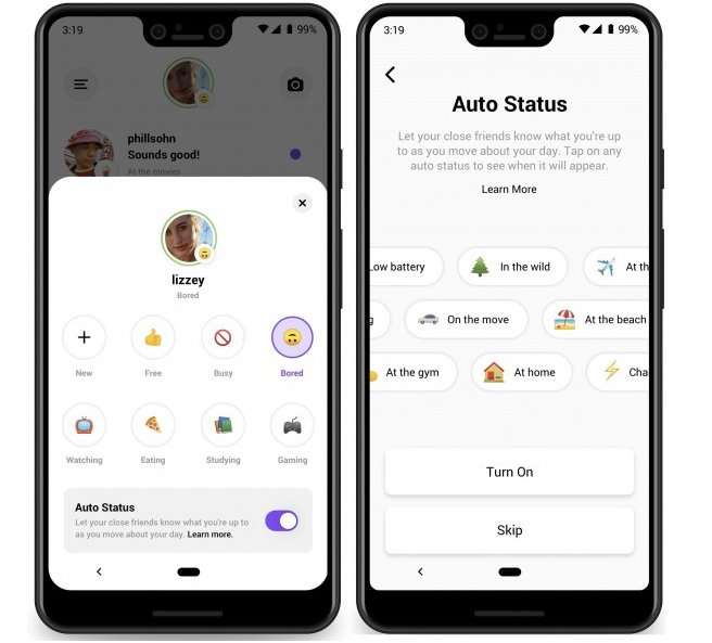 Threads позволяет выбирать статус, в качестве которого может использоваться текст или смайлик. Приложение умеет устанавливать автоматические статусы исходя из текущего местоположения, например «В кафе» (не раскрывая точную геолокацию), или состояния телефона – «Разряжена батарея», чтобы друзья знали, что вы можете отвечать на сообщения с опозданием.