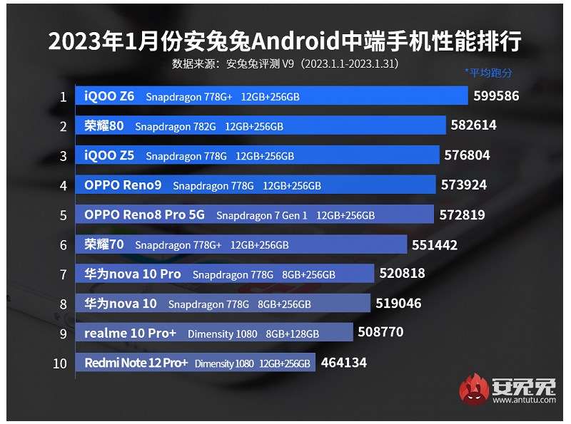 В подборке использована статистика за период с 1 по 31 января 2023 года. AnTuTu берет во внимание средние результаты теста, и добавляет только модели, прошедшие не менее 1000 тестов у разных пользователей.