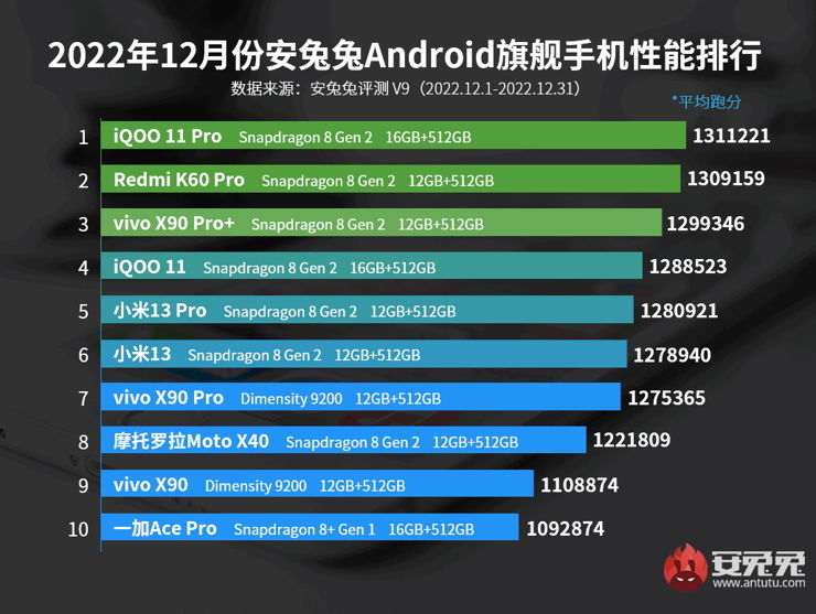 Практически вне конкуренции балом правит Snapdragon, но и самый производительный процессор Mediatek тоже не сдался без боя — в список вошли Vivo X90 Pro и Vivo X90, оснащенные Dimensity 9200. В целом можно сказать, что в 2022 году доминировали бренды Xiaomi и Vivo, 8 смартфонов в списке — это их устройства! Из конкурентов отметился Motorola Moto X40, а также OnePlus Ace Pro — единственный в топе смарт на Snapdragon 8+ Gen 1.
