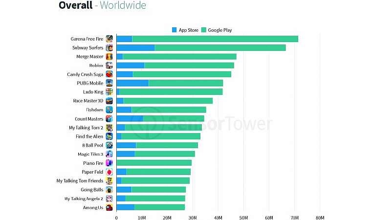 Мобильные игры аналитики выделили в отдельную категорию с собственным рейтингом. И тут лидирует Garena Free Fire — королевская битва в стиле PUBG Mobile. На втором месте — раннер Subway Surfers, на третьем — головоломка Merge Master. Ну а сам PUBG Mobile оказался лишь на шестой строчке. Хотя ему далеко до падения суперпопулярной до недавнего времени Among Us, которая рухнула сразу на 20 место.
