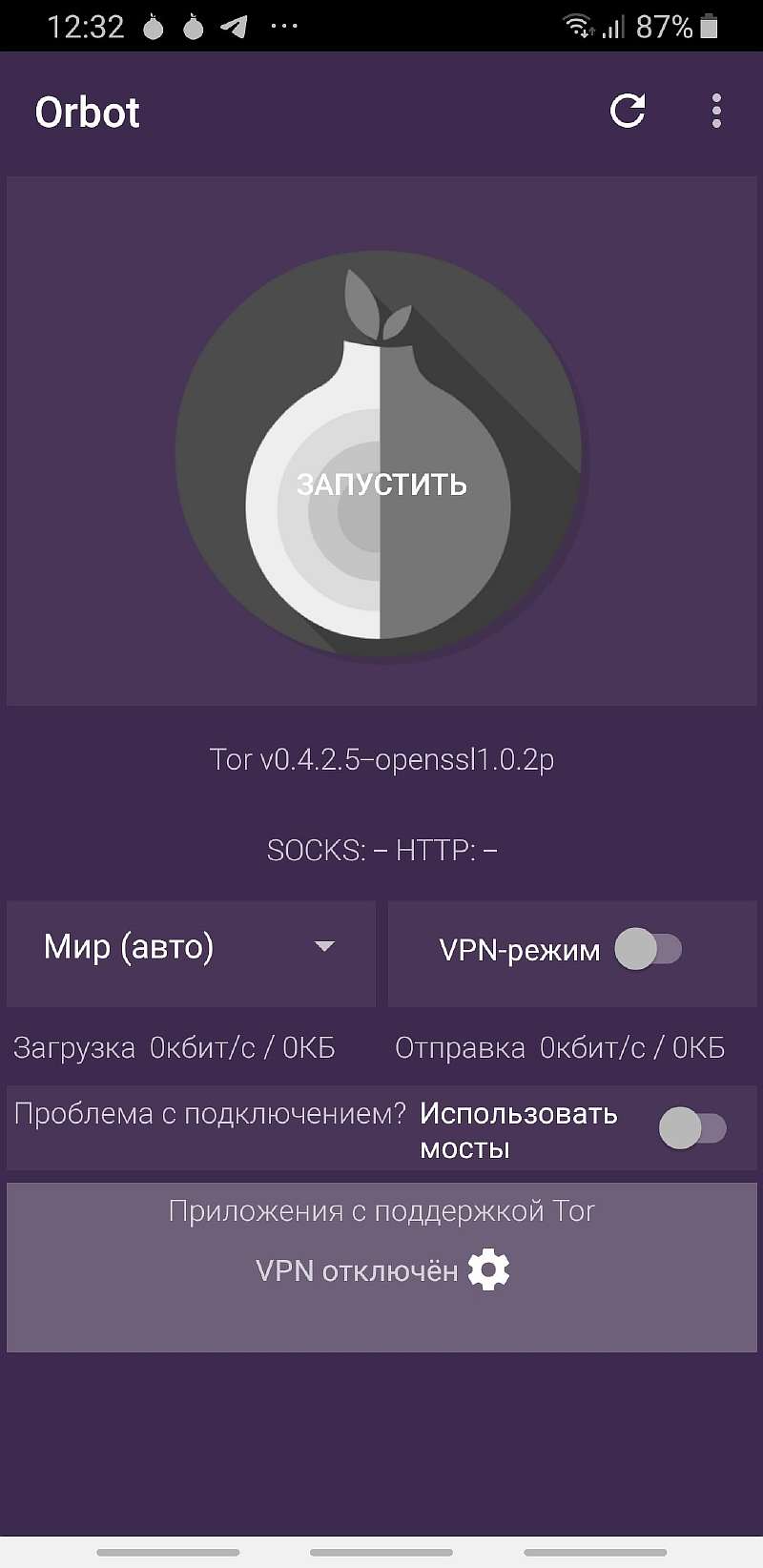 - Включите в Orbot VPN-режим, что позволит перенаправлять данные не только при использовании Tor Browser, но и при использовании других приложений, установленных на вашем мобильном устройстве.