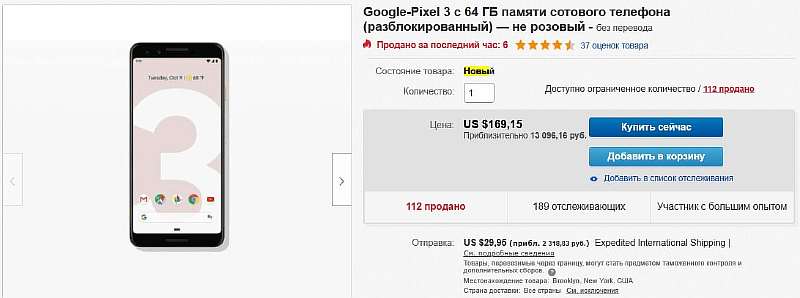 Где взять самый дешевый Pixel 3? Российские интернет-шопы пытаются продавать «тройку» за 30 тысяч рублей – невменяемая цена для смарта, вышедшего в конце 2018 года. Но если зайти на Ebay, можно обнаружить, что там новые Pixel 3, без привязки к какому-либо оператору, доступны за 169$ или ~13 100 рублей. Например, вот у этого проверенного продавца, с 142 760 оценок и 99.5% положительных отзывов.