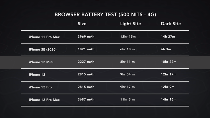 В ходе тестирования iPhone 12 Mini проработал всего 8 часов и 11 минут в режиме непрерывного серфинга интернета с подключением к LTE сетям. Яркость экрана при этом находилась на отметке 500 нит. Использование темной темы в браузере дало небольшой прирост автономности — она увеличилась до 10 часов 22 минут за счет энергоэффективного OLED дисплея.