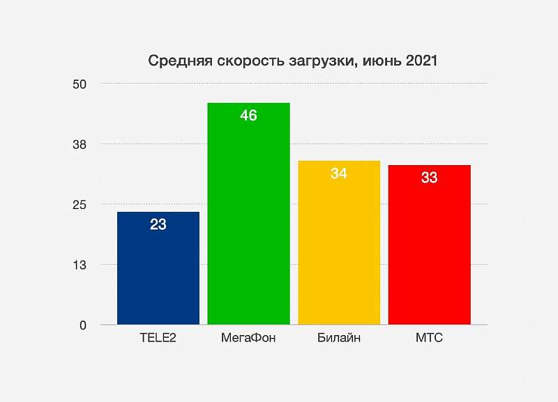 Тут есть безоговорочный лидер – Мегафон. За ним примерно с одинаковыми результатами идут середняки – МТС и Билайн, а вот абонентам Теле2 можно посочувствовать: средняя скорость в 23 Мбит/с ниже минимальной планки в 25 Мбит/с, которая нужна для быстрой работы большинства мобильных приложений.