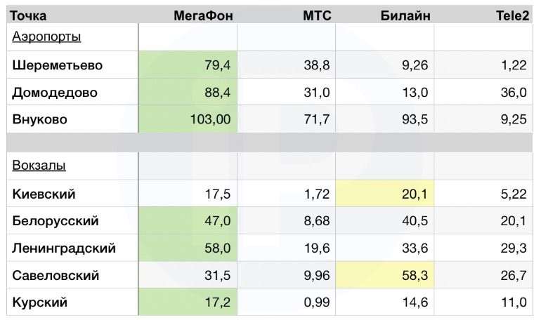 Замеры проводились в общественных местах с большим скоплением народа — аэропортах и вокзалах Москвы и Московской области. Тестер выбирал точку и поочередно вставлял в телефон SIM-карты операторов. Причем на каждого оператора пришлось по три замера, чтобы исключить случаи, когда смартфон завис или сеть просто не успела определиться вовремя. В итоговый результат попадало не среднее значение, а лучшее, и оценивалась исключительно скорость загрузки.