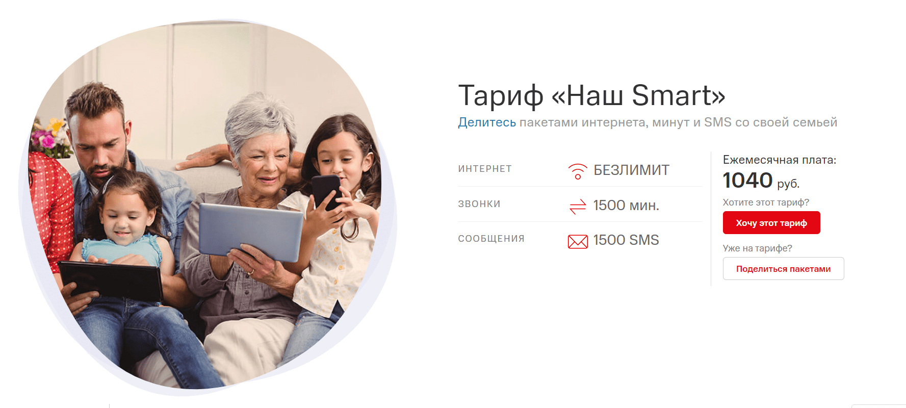 Для начала напомним, что вообще представлял собой «Наш Smart». Это был семейный тарифный план, рассчитанный на то, что владельцы нескольких SIM-карт будут пользоваться общими пакетами минута и интернета. Подключив «Наш Smart», абонент получал (Москва и Московская область):