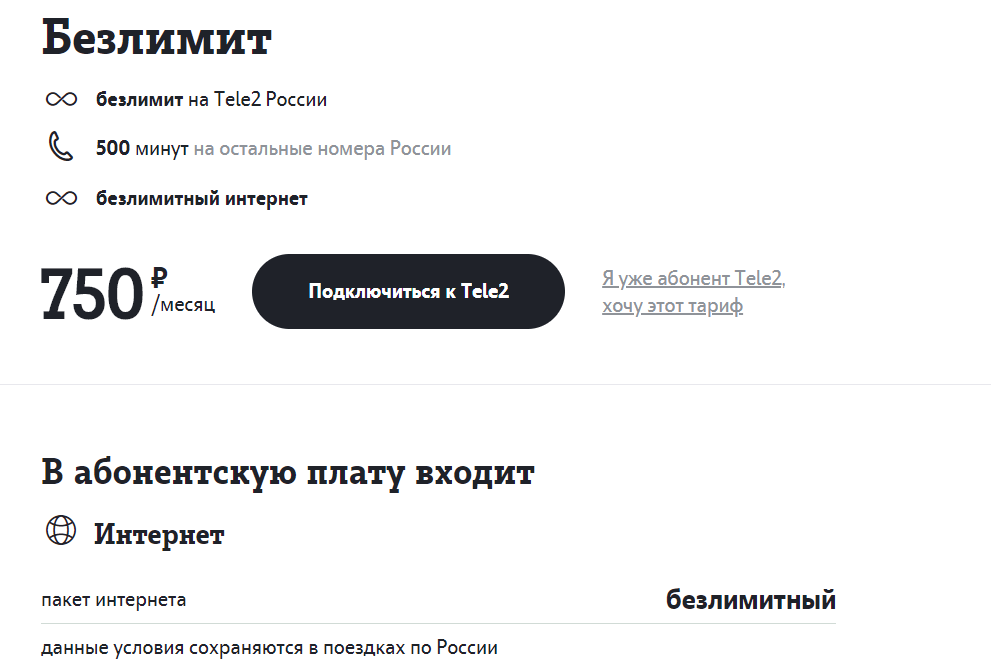 Не так давно тарифный план с говорящим названием «Безлимит» предоставлял абоненту неограниченный доступ в интернет, безлимитные звонки на номера Tele2 по всей России, пакет из 500 минут при звонках на номера других мобильных операторов, а также 50 SMS. Абонентская плата при этом для Москвы и Московской области составляла 650 рублей в месяц. Теперь же эта версия тарифа отправлена в архив и заменена новой. С аналогичным названием и абсолютно тем же набором услуг, но уже за 750 рублей ежемесячно.