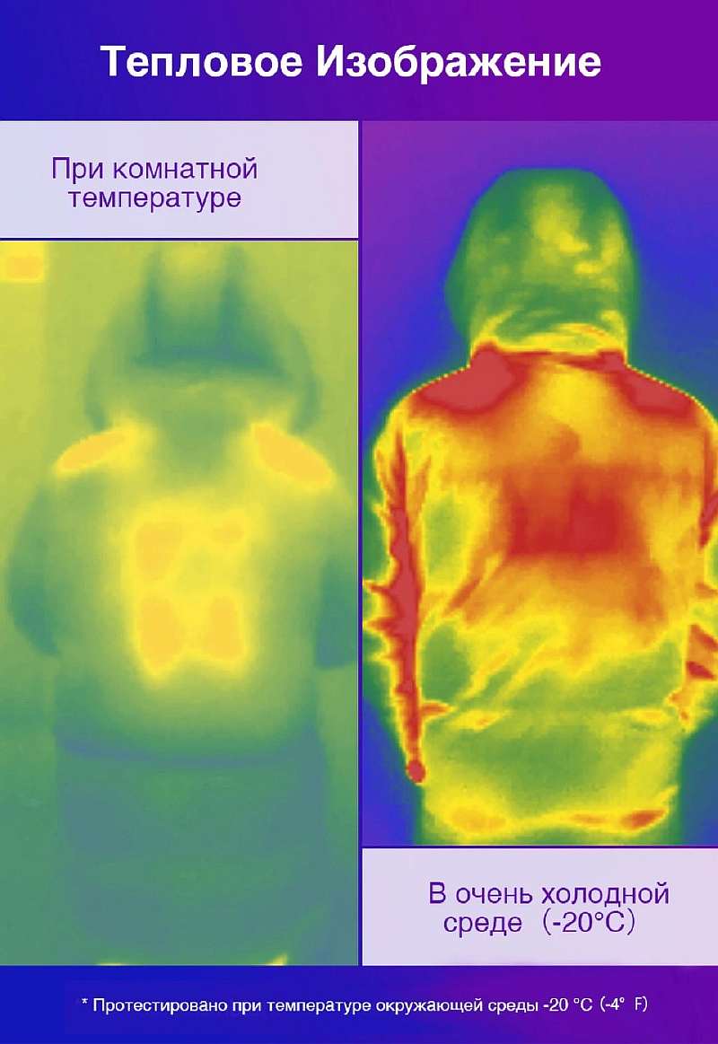 С помощью специальной кнопки питания температуру можно регулировать в пределах 38-53 градусов, на максимальной мощности от подключаемого повербанка на 10000 мАч подогрев работает до 8 часов. При этом курточку можно стирать в машинке без вреда для нагревательных элементов.