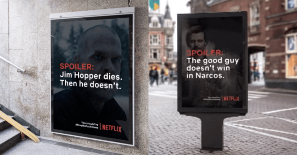 Идея пришла в голову студенткам рекламной школы Miami Ad School в Гамбурге. Две девушки не поленились и разработали целую рекламную кампанию, призванную уменьшить желание граждан нарушать карантин и посещать людные места. Стоит признать, что способ, которым предлагается отпугивать людей, по-своему гениален — спойлерить сюжетные повороты популярных сериалов от Netflix.