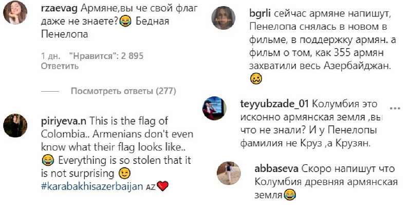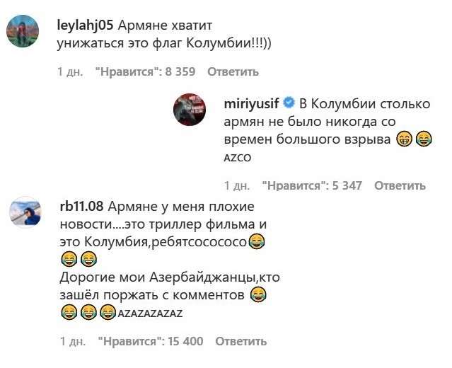 В итоге комментарии под постом голливудской звезды превратились в поле для кибербоя. Наверное, кто-то из армян перепутал флаг Колумбии с флагом Армении, и что-то написал в поддержу своей страны. Мы лично такого комментария не нашли — либо их уже потерли, либо они просто затерялись в тысячах других постов.