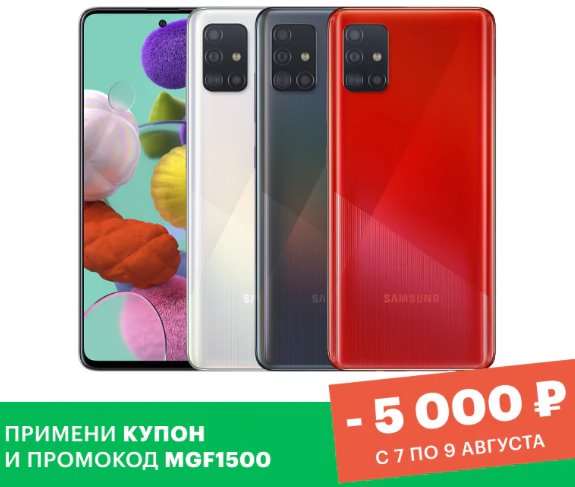 Galaxy A51 – главный бестселлер компании в 2020 году, подешевел до 14 990 рублей. Это самая низкая цена в официальном ритейле за все время, и даже у серовозов его не найти дешевле. Покупать A51 стоит ради шикарного 6.5-дюймового AMOLED дисплея с тонкими рамками, неплохой автономности, камеры, и наличия всех актуальных фишек – от NFC модуля до 3.5 мм разъема для наушников. Ссылка на акцию, промокод MGF1500.