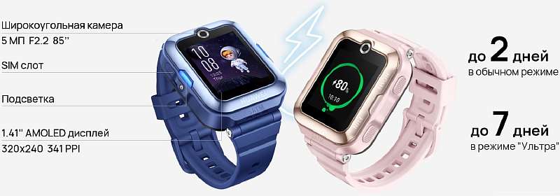 Watch Kids 4 Pro поддерживают LTE и имеют встроенный аккумулятор на 800 мАч, который работает два дня при использовании всех функций, и до 7 дней в режиме ожидания. Поддерживается быстрая зарядка – до 50% батарея восстанавливается всего за 20 минут.