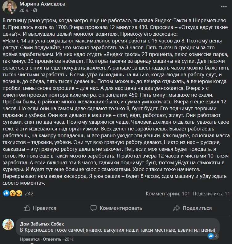 В сети разгорается бурное обсуждение подорожания услуг такси, катализатором которого стала журналистка Марина Ахмедова, поведавшая в фейсбуке нерадостную историю – заказав такси в аэропорт Шереметьево, девушка выложила за поездку 1700 рублей, хотя ехать было отнюдь не далеко. Причины подобного ценообразования заинтересовали Ахмедову, и она спросила о них водителя.