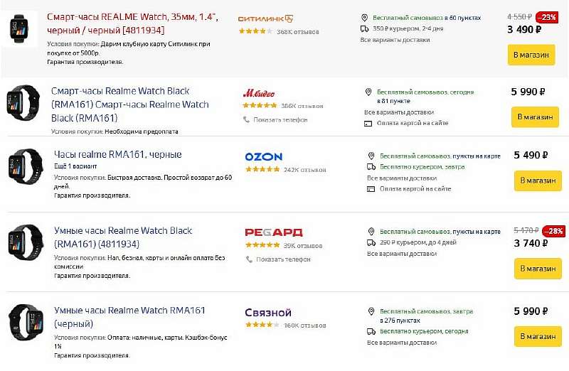 На старте продаж цена Realme Watch была не совсем адекватной. За часы просили 5 990 рублей, и с прайсом выше, чем у народных Amazfit Bip, они были мало кому интересны. Но сейчас аксессуар можно приобрести с отличной скидкой. В Ситилинке Realme Watch отдают за 3 490 рублей, и это колоссальная выгода в сравнении другими официальными ритейлерами.