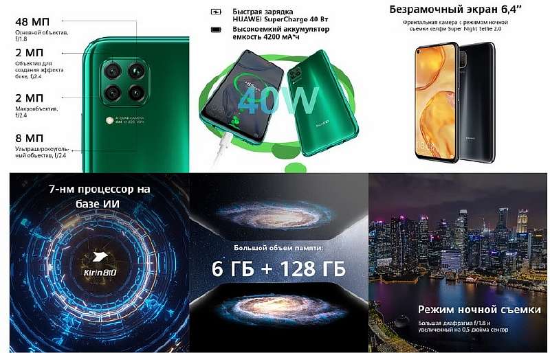 P40 Lite выполнен в трендовом дизайне с камерой в стиле iPhone 11 и встроенной в экран фронталкой. Это один из первых смартфонов компании на базе 7-нанометрового Kirin 810 в России, он получил 6.4-дюймовый FHD+ экран, квадрокамеру на 48+8+8+2 МП, мощный аккумулятор на 4200 мАч с поддержкой быстрой зарядки мощностью 40 Вт и 6/128 ГБ расширяемой памяти.