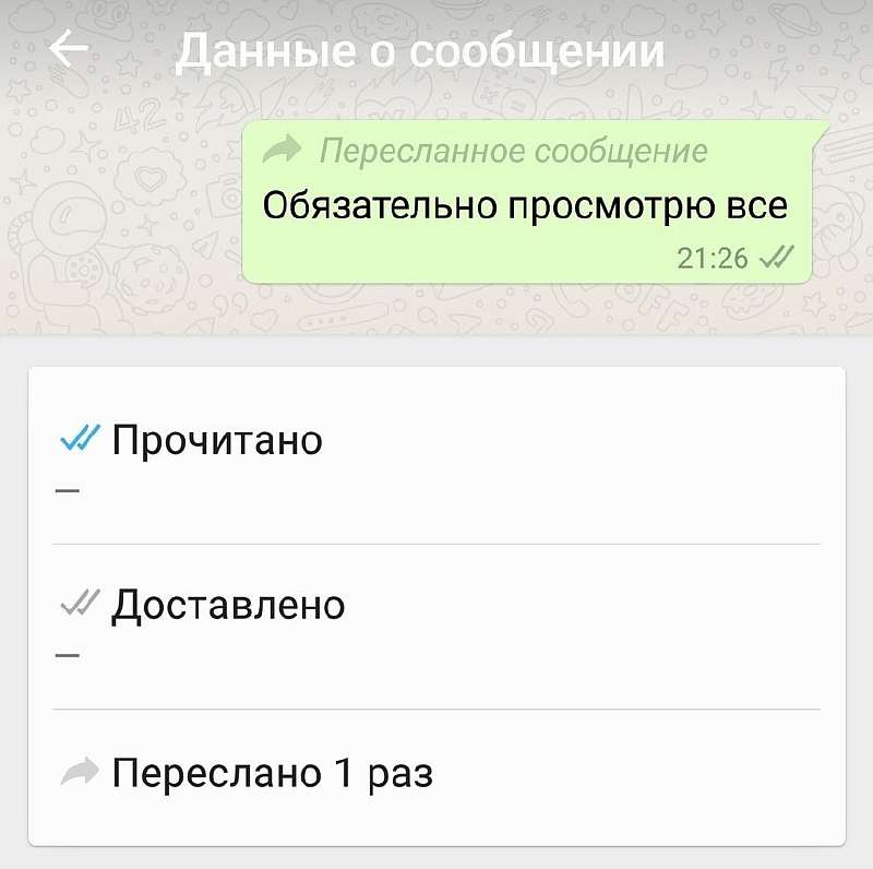 Если же собеседник пересылал кому-либо ваше сообщение, информация об этом также появится в разделе. Тут же будет указано, сколько раз сообщение отправлялось в другие чаты или личные переписки.