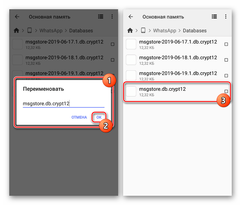 Для этого через любой файловый менеджер нужно найти папку приложения WhatsApp/Databases (на карте MicroSD или в памяти телефона), где расположены файлы резервных копий с названием типа msgstore-ГОД-МЕСЯЦ-ЧИСЛО.1.db.crypt12.
