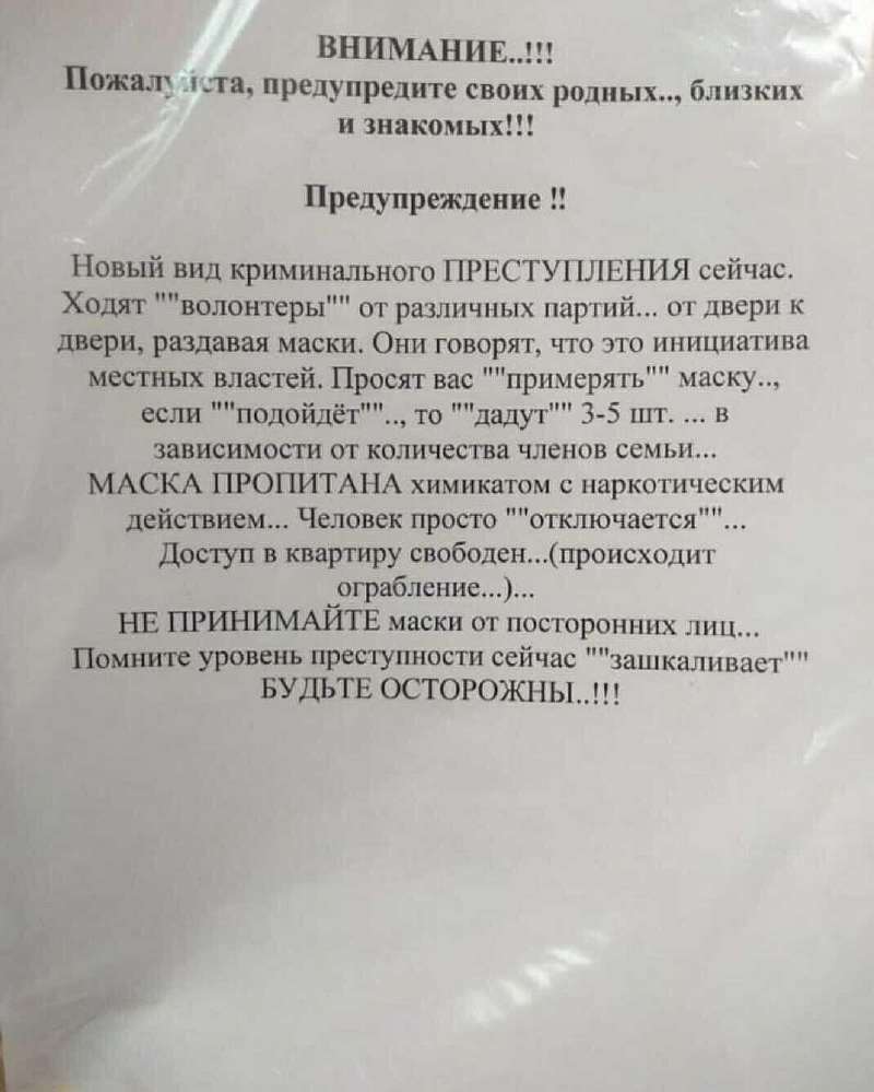 Из-за бездумных репостов по интернету распространяется очередная фейковая новость на тему волнующей людей пандемии коронавируса. Через WhatsApp рассылают сообщения с предупреждением о злоумышленниках, которые якобы накачивают людей наркотиками с помощью пропитанных медицинских масок, чтобы беспрепятственно проникать в чужие квартиры.