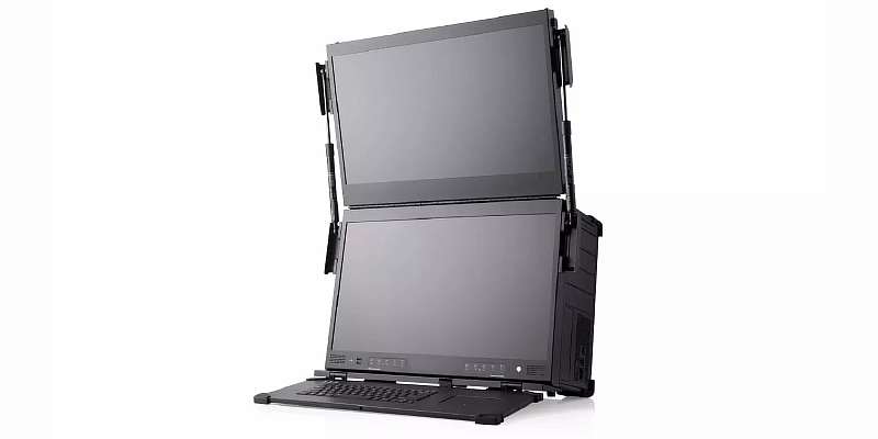В базовом варианте экранов у «ноутбука» два, остальные подключаются по модульному типу. Причем создатели весьма оригинально решили проблему габаритов — устройство складывается и выглядит как полноценный системный блок. В таком виде его удобнее транспортировать.