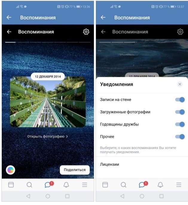 В разделе «Воспоминания» отображаются добавленные друзья, размещенные на странице фотографии, видео и посты, которыми можно делиться в историях, отмечая близких пользователей и добавляя к ним надпись, хэштег или стикеры. О самых важных событиях прошлых лет пользователям напомнят автоматические уведомления.