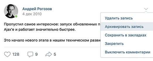 Как архивировать посты Вконтакте? Делается это посредством выбора соответствующего пункта в меню управления записью на стене.