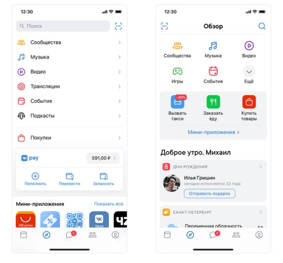 Самые значимые изменения коснулись дизайна и навигации по приложению. Первая из пяти главных вкладок теперь включает в себя новости и рекомендации, вторая — объединяет сообщества, стриминговые сервисы, VK Pay и различные приложения. За ними идут вкладки диалогов, поиска и профиль пользователя.