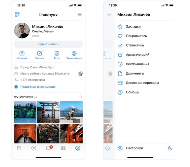 Изменения в дизайне личной страницы направлены на более простой доступ к инструментам для создания контента. Теперь иконки для записи сторис, создания публикаций и запуска стримов расположены прямо под пунктом Редактировать. Свайпами из профиля можно включить темную тему, зайти в настройки, закладки и документы.