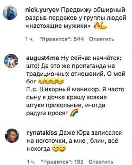 Несмотря на то, что ногти Дудя совсем не похожи на привычный женский маникюр, формула «лак + мужские ногти = агрессия» все равно сработала. Буквально за 3 часа после публикации в комментариях появилось множество осуждающих постов: