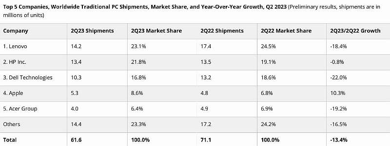 Lenovo, занимающая первое место по объему поставок, отгрузила 14.2 млн компьютеров, что на 18.4% меньше, чем в прошлом году. В спину ей дышит HP, продажи которой ухудшились только на 0.8% и составили 13.4 млн. единиц. Главным неудачником оказалась Dell – фирма все еще занимает третью строчку с результатом 10.3 млн, но результат хуже на целых 22% по сравнению со вторым кварталом 2022 года.