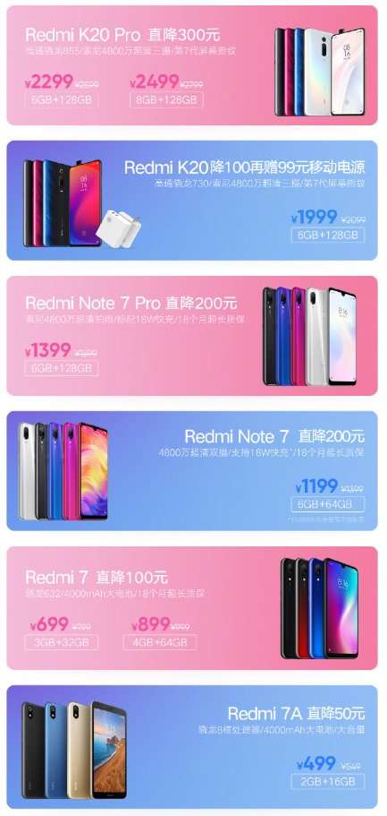 С завтрашнего дня более доступными станут Redmi 7 и 7A, Redmi Note 7 и Note 7 Pro, Redmi K20 и K20 Pro.