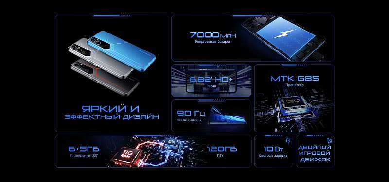 Сердцем новинки стал процессор Helio G85, которому ассистируют 4/64 или 6/128 ГБ памяти. С помощью технологии Memory Fusion оперативку можно расширить до 11 ГБ, а для увеличения хранилища предусмотрен слот под microSD объемом до 512 ГБ. Работает аппарат под управлением Android 12.