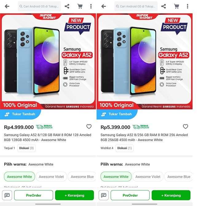 Точная цена Galaxy A52 в России станет известна только 17 марта. Но поскольку смартфоны компании у нас обычно стоят дешевле, чем в Европе, уже сейчас можно ориентироваться по данным из индонезийских магазинов, которые допустили слив прайс-листа новинок на местном рынке.