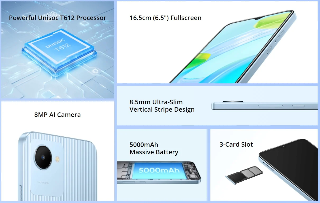 Спереди у C30 установлен 6.5-дюймовый IPS HD+ дисплей с каплевидным вырезом под 8-мегапиксельную фронталку и массивным подбородком, выдающим принадлежность модели к бюджетному сегменту. За производительность отвечает процессор Unisoc T612, который работает в связке с 2/3 ГБ оперативной памяти и 32 ГБ постоянной. Если последней вдруг недостаточно – можно воспользоваться microSD флешкой объёмом до 1 ТБ.