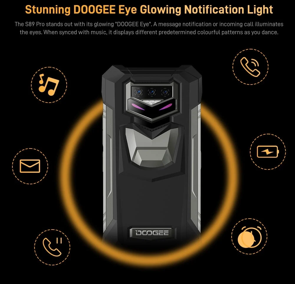 Производители обычно помещают на заднюю панель камеру (или камеры), логотип бренда и все. DOOGEE не боится идти дальше – у S89 Pro есть то, что называется «DOOGEE Eye». Это крупный V-образный светодиод, который действует как индикатор уведомлений, и отличает этот смартфон от других устройств.