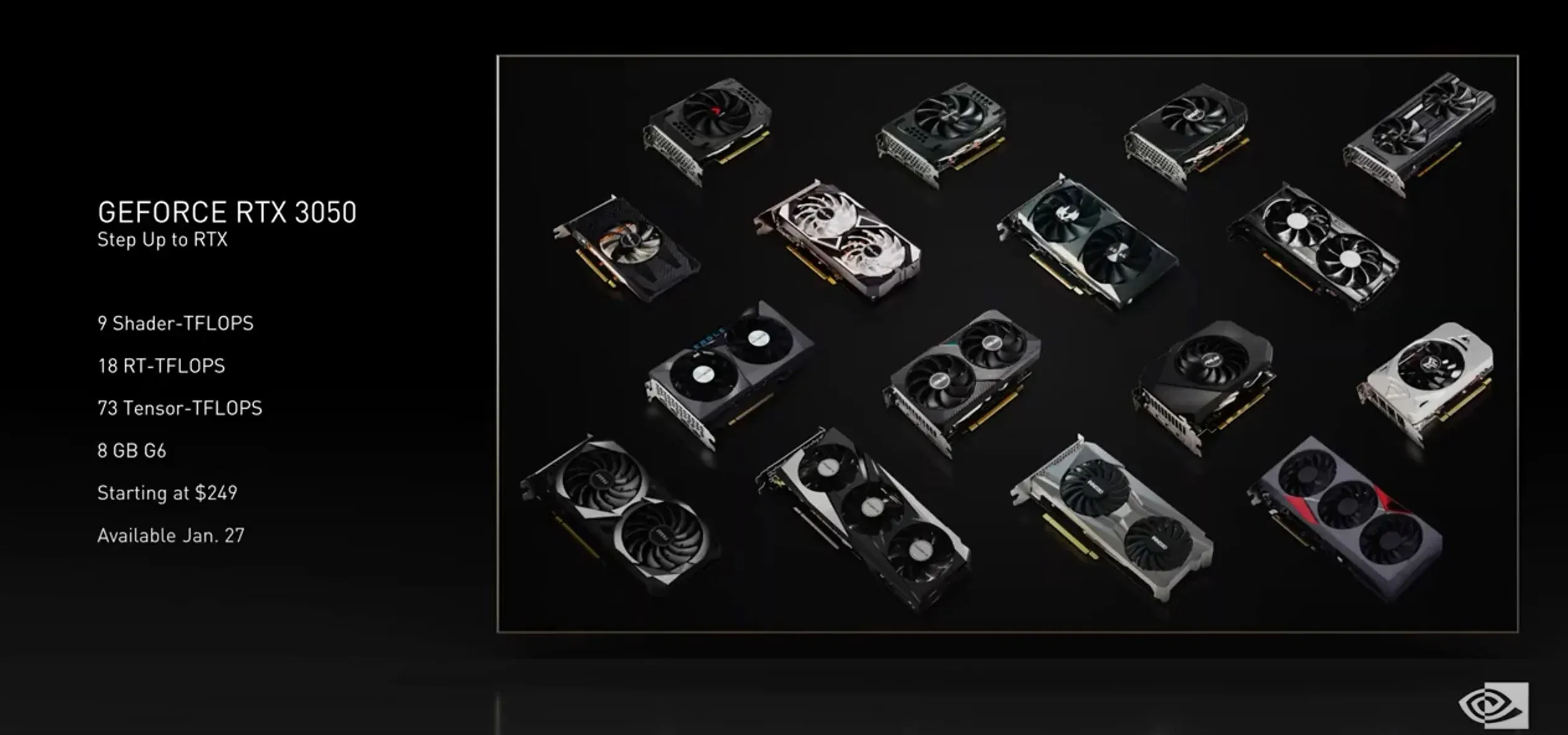 Чтобы хоть как-то помочь рядовым геймерам, которые хотят обновить видеокарту, Nvidia выпустила бюджетную модель GeForce RTX 3050 за $250. В России она начнет продаваться 27 января по рекомендованной цене 25 000 рублей. Да, наценка присутствует, но в целом прайс демократичный – столько же сейчас просят за устаревшую во всех планах GeForce GTX 1050 Ti.