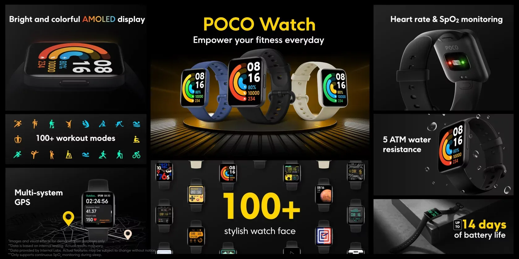 POCO Watch получили дизайн с квадратным дисплеем на манер Apple Watch. Он выполнен по технологии AMOLED и имеет разрешение 360х320 пикселей при диагонали 1.6 дюймов. Для экрана доступно более 100 различных циферблатов.