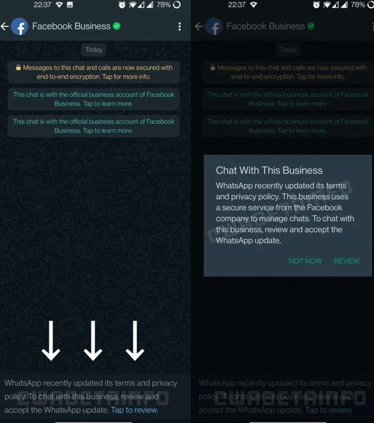 Правда, есть один нюанс – отказавшиеся от соглашения пользователи не смогут получать сообщения от бизнес-аккаунтов. Последние обычно принадлежат интернет-магазинам и службам доставки, которые используют WhatsAp для информирования клиента о статусе заказа и промо-акциях. При попытке открыть чат с ними будет вылезать уведомление о необходимости принять все то же соглашение.
