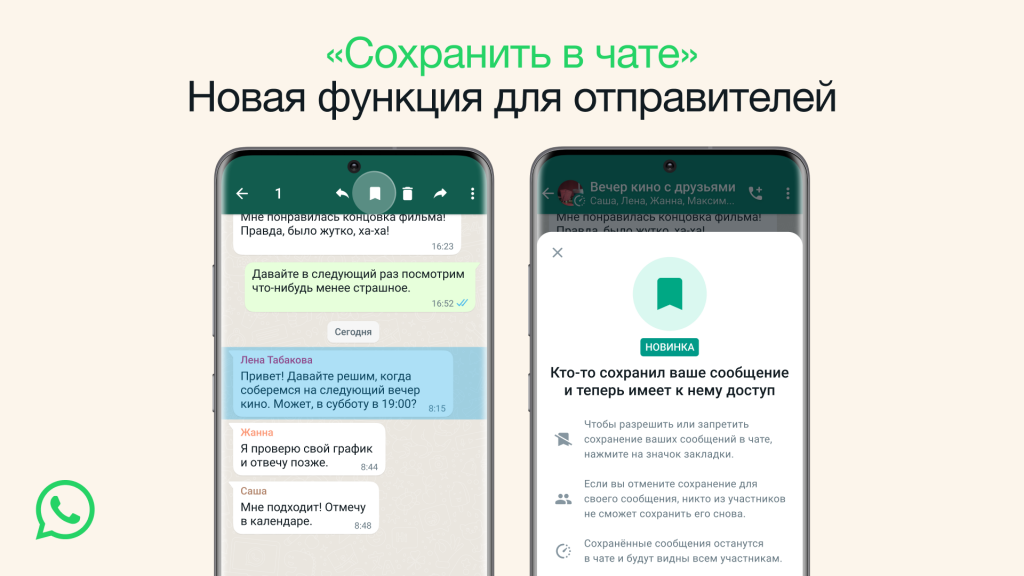 Сохраненные сообщения в WhatsApp будут отмечаться значком закладки. Их можно будет найти в папке «Сохраненные сообщения» с сортировкой по чатам. Новая функция осложнит жизнь мошенникам и другим нечистым на руку людям, которые после всех договоренностей исчезают в неизвестном направлении, подтерев улики.