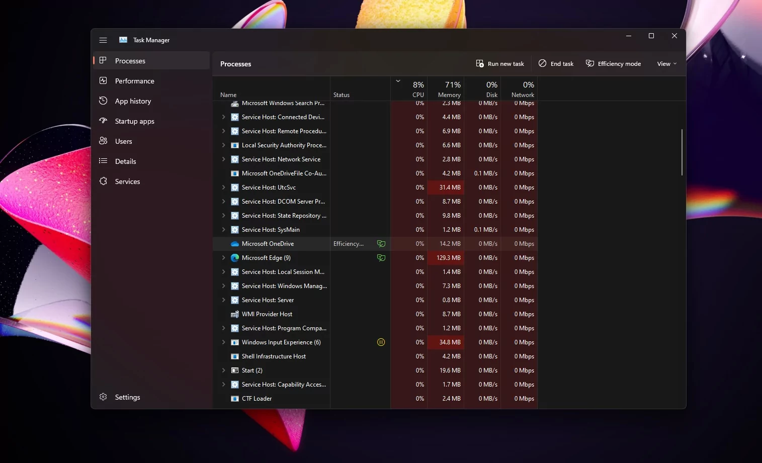 У самого окна диспетчера больше нет акрилового размытия, теперь на смену ему пришел эффект Mica — окно адаптируется под фон рабочего стола, но больше не просвечивает насквозь. И это правильное решение, размытие требовало дополнительных ресурсов системы при сомнительных эстетических качествах.
