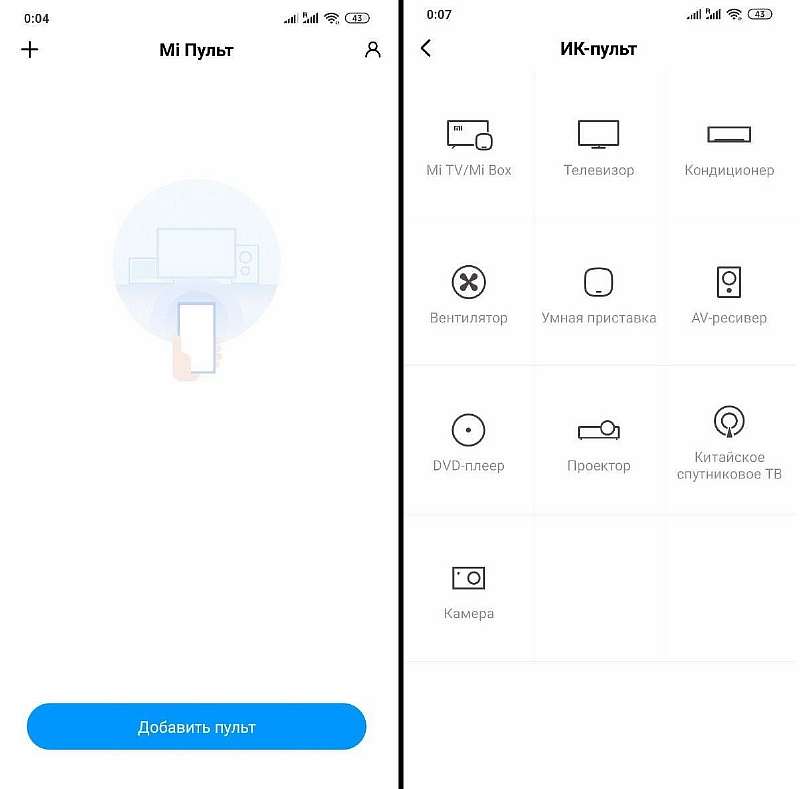 Для этого запустите приложение Mi Пульт, нажмите Добавить пульт, и выберите устройство из списка доступных.