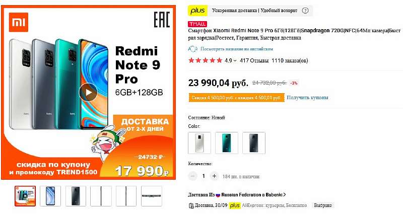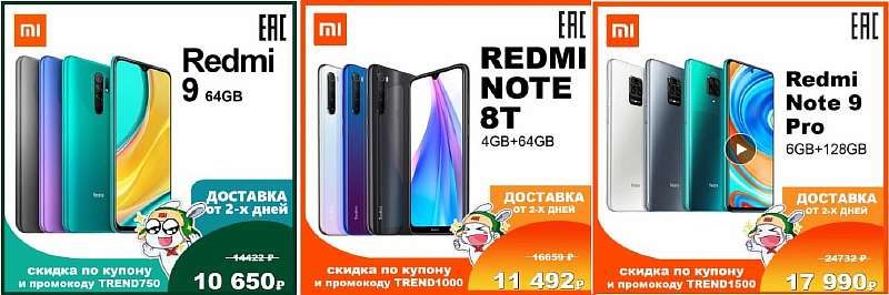 И, наконец, самое интересное предложение: Redmi Note 9 Pro на чипсете Snapdragon 720G. Девайс с 6/128 ГБ памяти подешевел с 23 990 до 17 990 рублей. Это хороший выбор для требовательных пользователей, помимо отличного процессора он может предложить трендовый дизайн, продвинутую 64-мегапиксельную камеру с шириком, мощную батарею на 5020 мАч с быстрой 30-ваттной зарядкой в комплекте. Аппарат работает на актуальном Android 10, имеет ИК-порт для управления бытовой техникой и NFC модуль. Вот ссылка на акцию, используйте купон и промокод TREND1500
